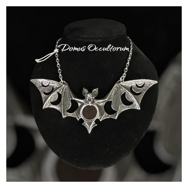 Collana a forma di pipistrello con fasi lunari intagliate e specchio centrale intarsiato.